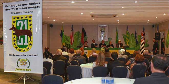 50° Convenção Nacional dos Clubes Dos 21 Irmãos-Amigos, realizada em 08 e 09 de novembro de 2013, na cidade do Guarujá-SP, tendo a mesma cumprido as determinações estatutárias, bem como alcançando o êxito de 50 (cinquenta) Convenções Nacionais ininterruptas falando do Brasil e de nossa brasilidade, honrando os objetivos de seu fundador o industrial Rogério Pinto Coelho, precisamente desde 24/05/1949.
